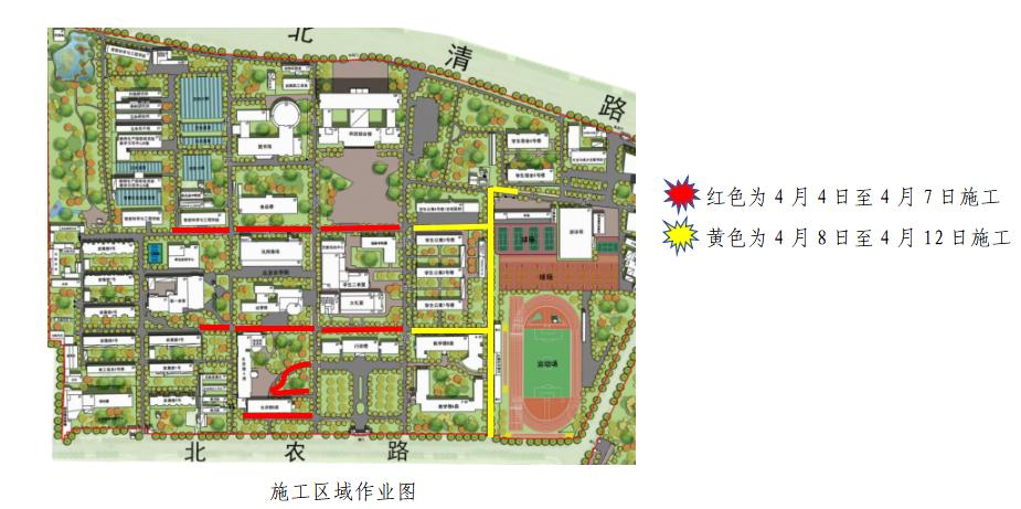 2026年4月4日上午7:00至2026年4月7日22:00,对国槐路及玉兰路西段(银杏路以西)、生资楼B座南北路进行施工(红色线标识,详见施工区域作业图)。