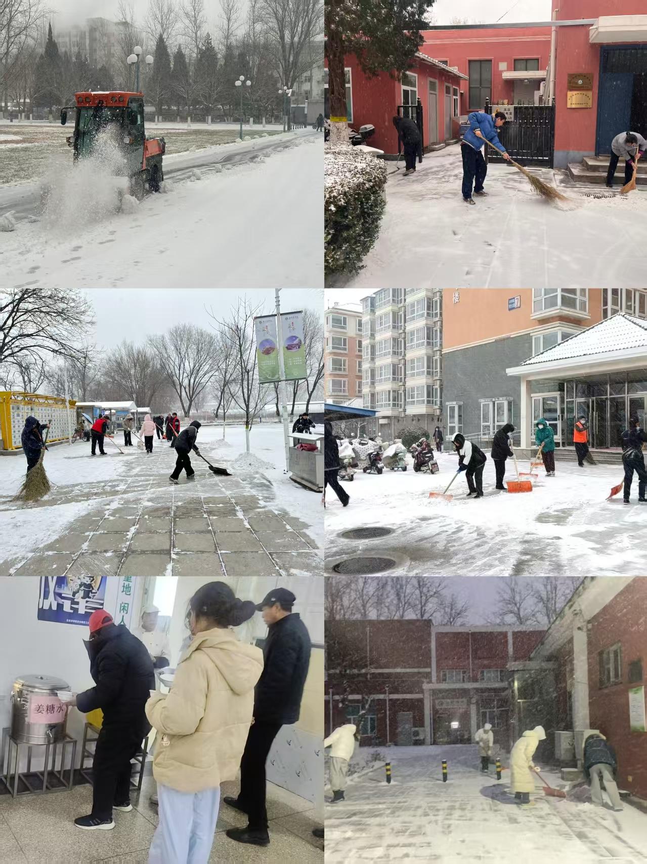 寒风中的坚守,是最暖的风景。后勤工作人员分工协作:机械组驾驶设备反复清扫主干道及停车场,人工组手持工具清理台阶、坡道等机械作业盲区,维修组同步排查校舍屋顶、树木枝干积雪隐患,保洁组在楼宇入口铺设防滑垫、摆放“小心地滑”警示标识。供暖组24小时值守,保障室内温度稳定,食堂团队提前到岗,备好暖暖的姜糖水,确保热餐热饮准时供应。冰雪覆盖的路面,汗水凝结成眉梢的冰霜,却挡不住大家“抢时间、保安全”的干劲。